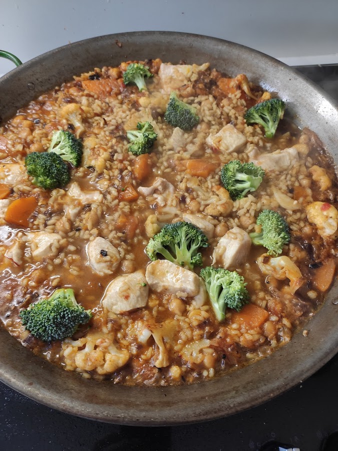 Metemos la paella al horno que tendremos precalentado a 200º con calor arriba y abajo, para terminar de hacer el arroz en el horno.