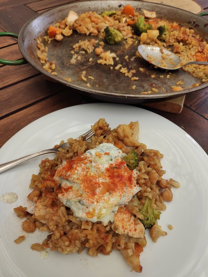 Sacamos el arroz del horno y acompañamos con esta salsa por encima a la que añadiremos en el momento de servir un poquito de aceite de oliva y un toque de pimienta negra.