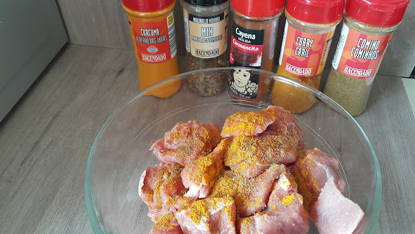 Para ello colocamos el pavo, puede ser pollo también, cortado a dados en un bol y añadiremos un chorrito de aceite y las especias al gusto, curry, comino, cúrcuma, cayena y pimienta recién molida. Mezclamos bien y dejamos unos minutos.