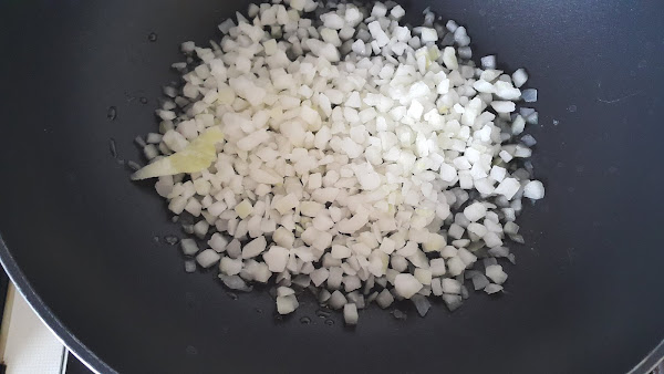 Seguidamente picamos la cebolla y la ponemos a fuego bajo en una sartén con un poco de aceite para que se poche lentamente.