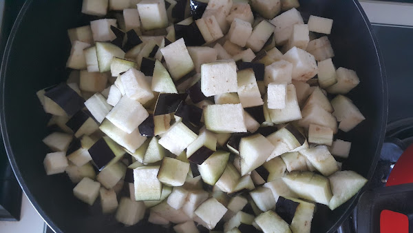 Lo primero que haremos será cortar la berenjena a dados y dejarla a remojo en agua con sal para que no amargue.