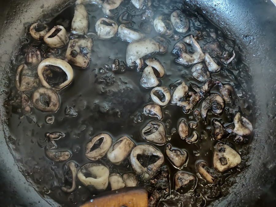 Cuando el caldo haya reducido a la mitad estará listo el calamar.