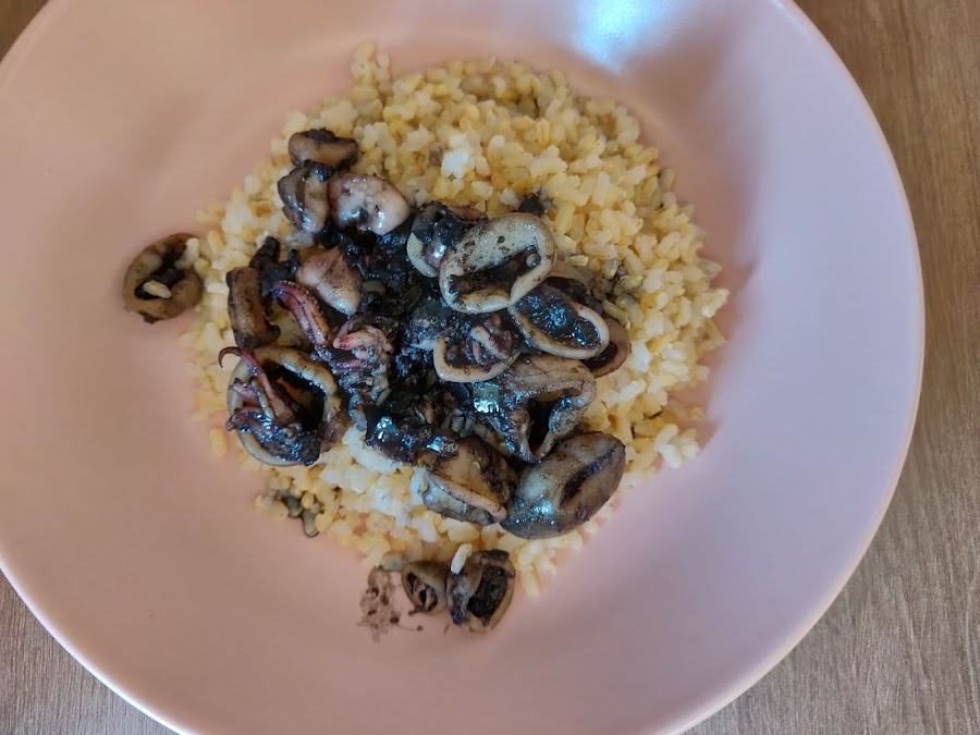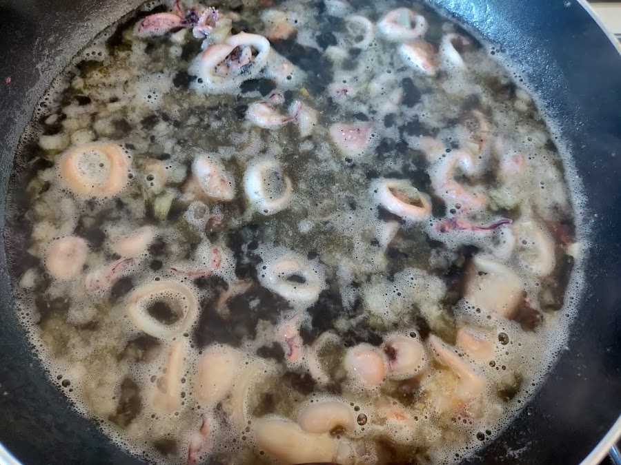Añadimos un vaso de agua junto a la media pastilla de caldo de pescado y el sobre de tinta al calamar y dejamos cocinar a fuego medio unos 5 minutos.