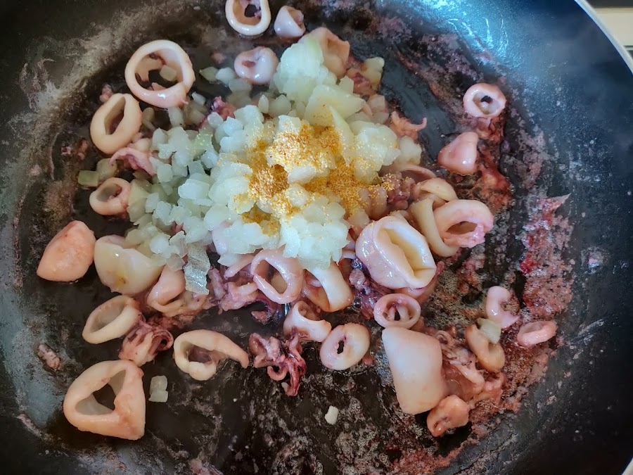 Cuando se haya eliminado todo el jugo que suelta el calamar, añadimos un poco de