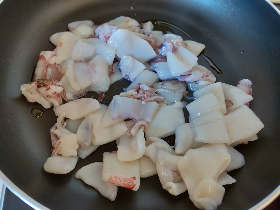 Seguidamente ponemos el calamar, previamente descongelado y limpio, en una sartén anti-adherente y dejamos a fuego bajo tapado.