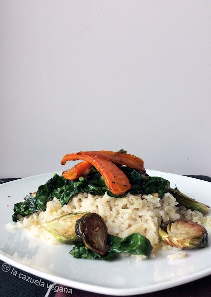 Recetas veganas Arroz integral con espinacas, coles de Bruselas y zanahorias glaseadas