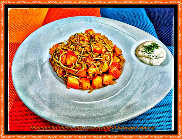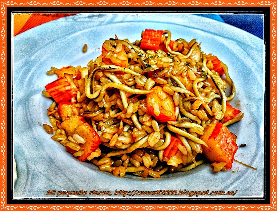 Ponemos una sartén al fuego con una gota de aceite y echamos los ajos laminados y sofreímos hasta que doren, añadimos la cucharadita de pimentón y mezclamos con el ajo para enseguida añadir las angulas sucedáneas y los palitos de cangrejo hechos trozos y los dejamos cocinar unos minutos, ponemos el arroz y salpimentamos al gusto, sacamos de la sartén y servimos, yo lo he emplatado en un plato de porcelana de la fábrica Porvasal.