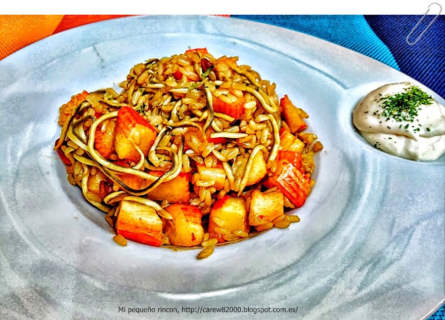 Añadimos la cucharadita de pimentón y mezclamos con el ajo para enseguida añadir las angulas sucedáneas y los palitos de cangrejo hechos trozos y los dejamos cocinar unos minutos.