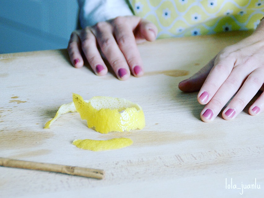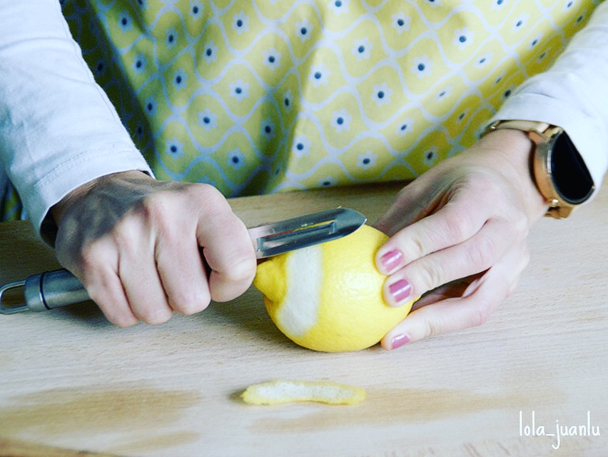 Mientras esperamos a que la leche esté lista, lavamos un limón y con ayuda de un pelador extraemos la cáscara.
