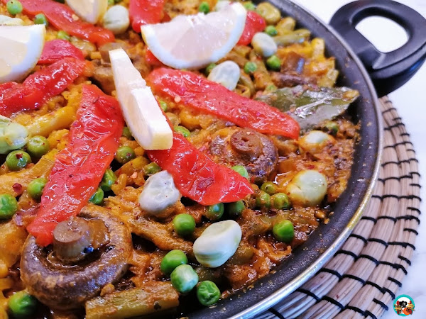 2.- Cortamos en cubos la cebolla, pelamos el ajo y lo cortamos en dados. En un caldero chato ponemos a calentar unas cucharada de aceite de oliva. Sofreímos la cebolla y el ajo, incorporamos la hoja de laurel, las hebras de azafrán y la salsa de soja. Agregamos el arroz, rehogamos todo bien unos minutos. Añadimos el pimentón, mezclamos todo bien. Añadimos las verduras que hemos cocinado anteriormente y el caldo de las verduras. Ponemos los champiñones, cocinamos el arroz integral con las verduras 25 o 30 minutos. Incorporamos las tiras de pimientos asado. Apagamos el fuego y dejamos reposar el arroz unos minutos.