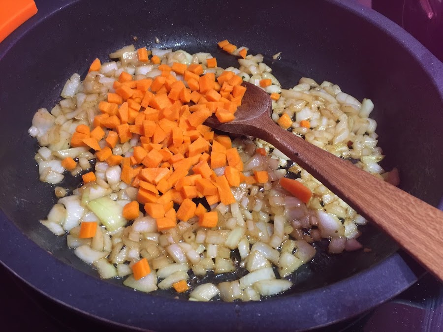 4. A continuación añadimos la zanahoria y finalmente el pimiento verde. Rehogamos las verduras durante 5 o 6 minutos.