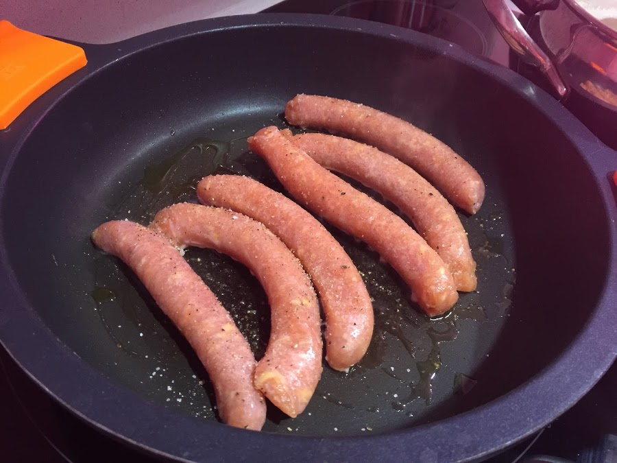 2. Mientras se va cocinando el arroz, preparamos el resto del sofrito. En una cazuela bien caliente ponemos las salchichas de pollo. A fuego medio las doramos bien por fuera, y que se hagan bien por dentro. Es importante que la salchicha sea de calidad, es decir que sea 100% pollo, evitando todo tipo de féculas, conservantes, aromas, colorantes... Acudir a vuestro carnicero de confianza y evitar las grandes superficies. Yo siempre en Santmartí 1850, para mi los mejores, con diferencia.