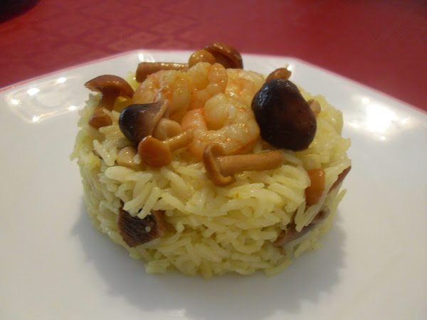 Saltear en una sartén o wok las gambas con un poco de aceite un diente de ajo picadito y una pizca de sal, añadir las setas surtidas escurridas y rehogar todo junto.