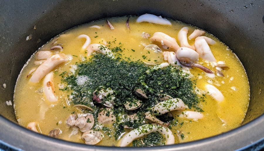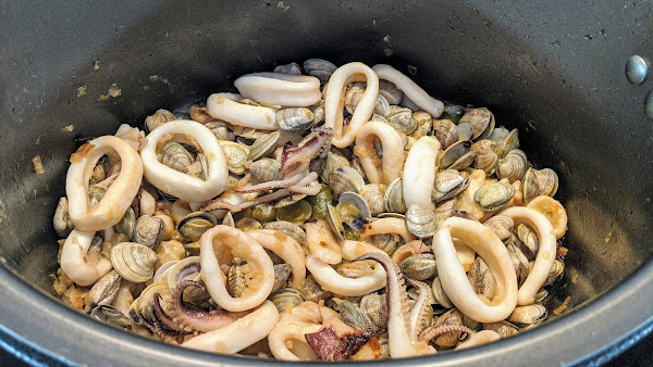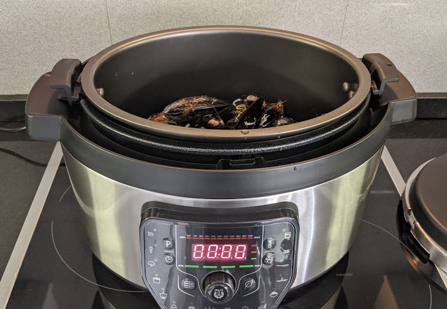 En FUSSIONCOOCK FC 7 smart abre los mejillones en menú guiso, 2 minutos. Utiliza el menú freír para el sofrito. Para cocer el arroz selecciona guiso 6 minutos.