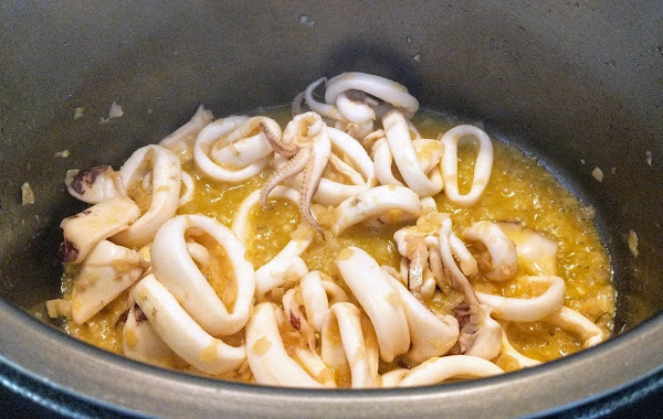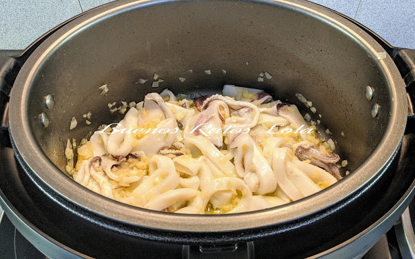 Lavamos la cubeta y secamos bien. Ponemos un buen chorro de aceite y programamos menú sofreír a 160 grados. Incorporamos la cebolla y el ajo muy picaditos y dejamos que se rehoguen. Cuando empiecen a dorarse las puntas de los primeros trocitos de cebolla echamos los calamares