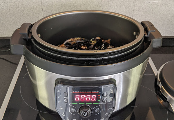 Lavamos muy bien los mejillones y los ponemos en la cubeta. Programamos menú guiso, 160 grados y 2 minutos. Despresurizamos al acabar y colamos el caldo de la cocción. Retiramos las valvas y reservamos los mejillones
