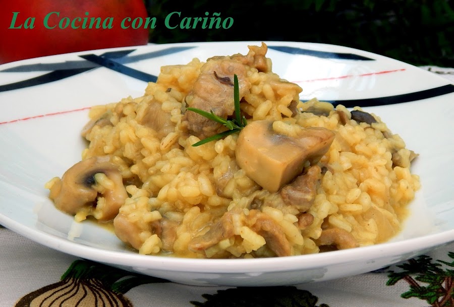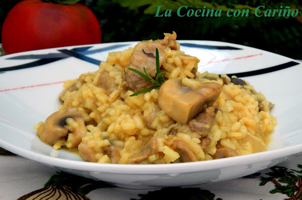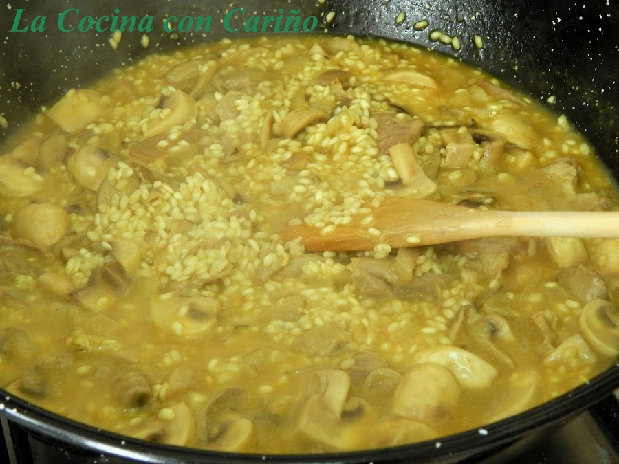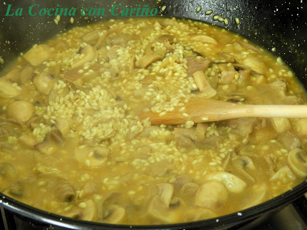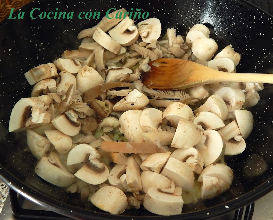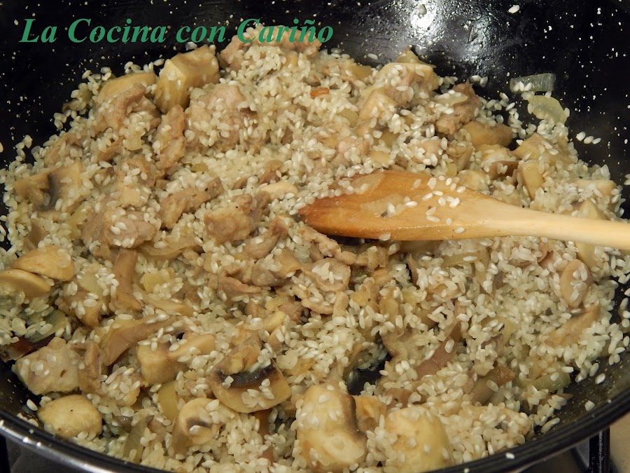 Cuando se pone transparente, echamos los champiñones y las setas, rehogándolas unos 3 ó 4 minutos. Pasado este tiempo echamos el arroz y los salteamos por un minuto más.