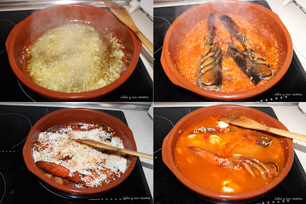 En una cazuela de barro, ponemos un poquito de aceite y sofreímos la cebolla y los ajos, cuando estén dorados añadimos los pimientos y el tomate , dejamos que se sofrían bien y echamos el bogavante troceado y el laurel, lo sofreímos y añadimos el arroz y lo sofreímos un poquito, añadimos el caldo caliente.