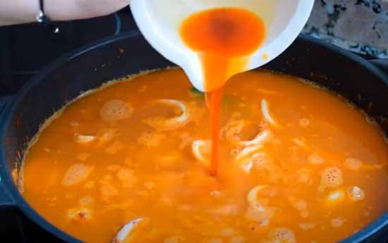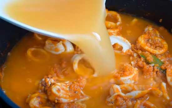 Luego echamos el caldo de pescado caliente. Pondremos el triple de caldo que de arroz. Os aconsejo medir el arroz en un recipiente y después de echarlo en la cazuela, usar el mismo recipiente para medir el caldo de pescado.