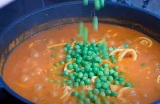 Dejamos a fuego medio cocinar el arroz unos 15 a 20 minutos y cuando veas que al arroz le quedan unos 5 minutos para hacerse le añadimos unos guisantes.