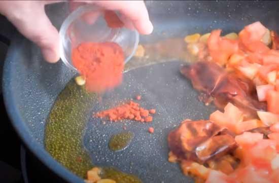 Y a continuación, agregamos los tomates cortados en trozos o rallados. Ponemos en una de las partes de la cazuela la cucharadita de pimentón, le damos unas vueltas en el aceite y lo integramos rápidamente con el tomate.