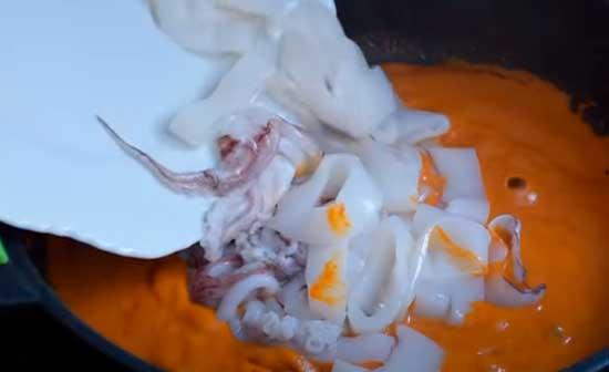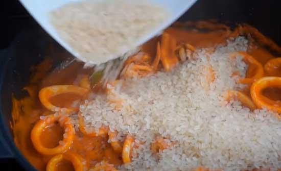 Ahora, ponemos el fuego medio alto y echamos los calamares cortados en anillas de 1 cm. o un poco más. Lo dejamos unos 3 ó 4 minutos hasta que comenzamos a ver que los calamares empiezan a encoger un poco de tamaño.Entonces es cuando añadimos el arroz (80 a 90 gr por persona), lo dejamos 2 ó 3 minutos dando unas vueltas con el sofrito y los calamares para nacararlo un poco y que absorba el sabor.