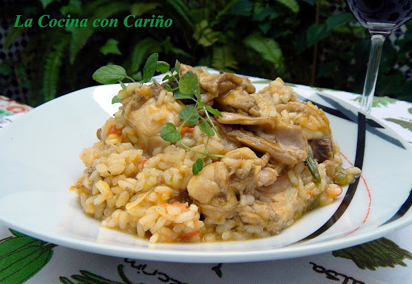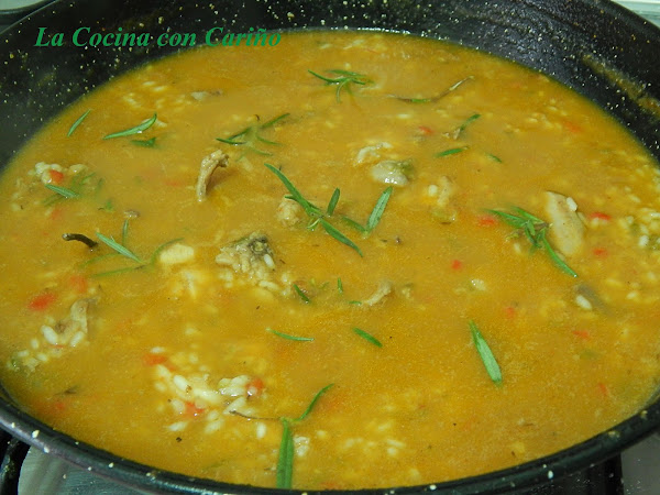 Tras unos 15 minutos de cocción a fuego medio y moviendo con dulzura de vez en cuando, apartamos el perol y dejamos reposar unos 5 minutos. Al apartarlo el aspecto ha de ser de quedar aún caldo. Este lo terminará de absorber el arroz y nos quedará en su punto. Para el reposo, añadimos unos ramilletes de romero y tomillo fresco