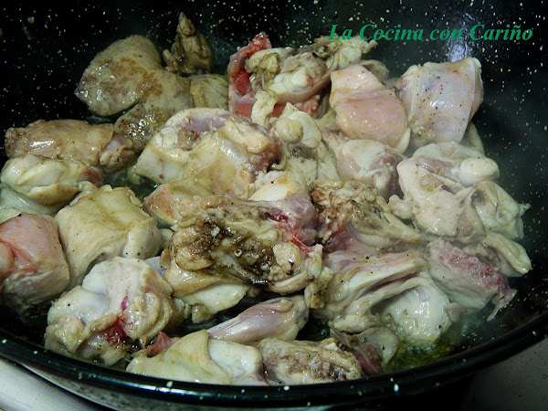 A esta receta después cada uno le puede hacer las variantes que desee. Empezamos poniendo el aceite en un perol a fuego medio. Una vez caliente añadimos el conejo salpimentado. Lo doramos pero sin pasarnos, solo queremos que el sabor de la carne no sea de carne cocida.