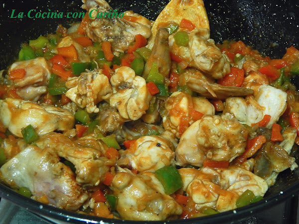Apartamos y ponemos los pimientos con un poco de sal en el perol. Dejamos sofreír hasta que estén tiernos y entonces, ponemos el tomate y el laurel. Un par de minutos después, añadimos nuevamente el conejo y lo dejamos todo junto por otros dos minutos. En una sartén vamos a dorar el hígado del conejo con un poco de aceite. Lo pasaremos a un mortero y lo majaremos con fuerza y le añadiremos el vino blanco. Lo añadiremos al guiso.