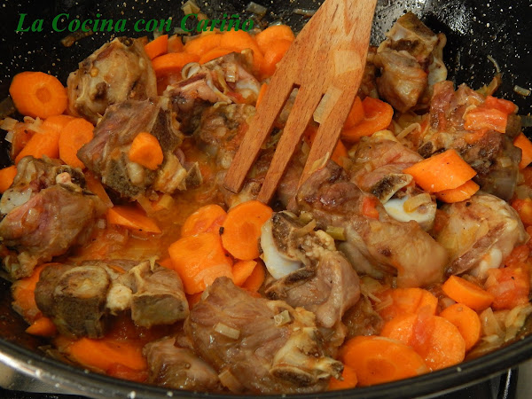 Cubrimos de agua y las zanahorias, junto con las hierbas y especias y dejamos reducir, hasta que esté blanda la carne y se haya consumido todo el agua. Como unos 45 minutos.