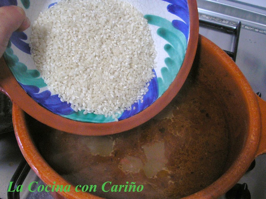 Nos quedamos con la altura a la que estaba el caldo antes de reducir y transcurridos los minutos dichos anteriormente, rellenados de agua y al romper a hervir nuevamente, añadimos el arroz. LO haremos a fuego medio/fuerte, los primeros 10 minutos. Luego lo pondremos más suaves. Si vemos que necesitamos un poco más de líquido añadimos un poco más, pero recordad que es un arroz Melo, no caldoso.