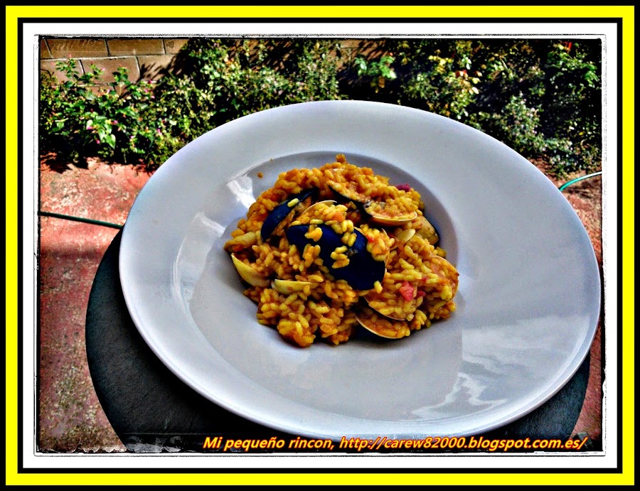 Ahora añadimos los mejillones , las almejas y las gambas y removemos , añadimos el arroz y cubrimos con caldo solo hasta que tapemos el arroz , ponemos una cucharadita de colorante y dejamos cocinar lentamente , cuando vaya evaporando el caldo , añadimos el jugo que teníamos de los mejillones y otro cacito del caldo , así hasta que el arroz lo tengamos cocido y muy meloso , haber que no termine de estar seco y que tampoco tenga demasiado caldo , con esta técnica tendremos un arroz buenísimo .