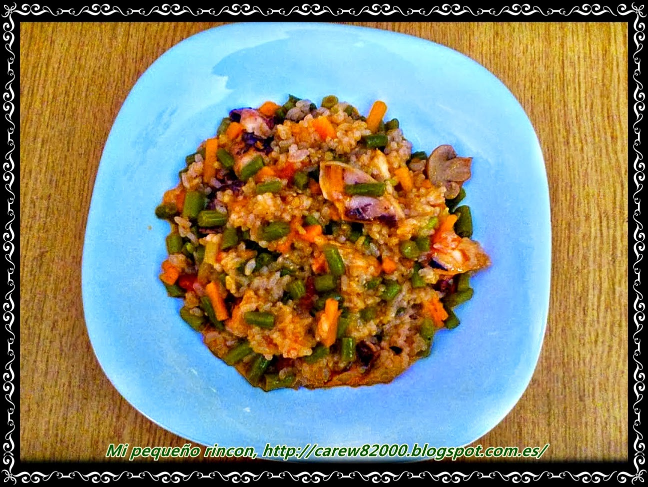 Lavamos y cortamos las verduras en juliana y las judías en trocitos pequeños y ponemos todo a pochar en una cazuela a fuego lento. Cortamos los champiñones por la mitad, cortamos el calabacín en bastoncillos y el tomate lo pelamos y lo reservamos. Añadimos una cucharadita de pimentón a la cazuela donde están pochándose las verduras, echamos una cerveza Cervetri y movemos todo bien , añadimos el tomate , el calabacín y los champiñones y seguimos removiendo , ahora añadimos el arroz midiendo lo que echamos para añadir tres partes de agua por arroz echado , y lo dejamos cocinar , pero vamos probando el caldo para ver como esta de sal , los últimos minutos lo coceremos en el horno ya que le da un toque de calor muy interesante que deja el arroz muy meloso.