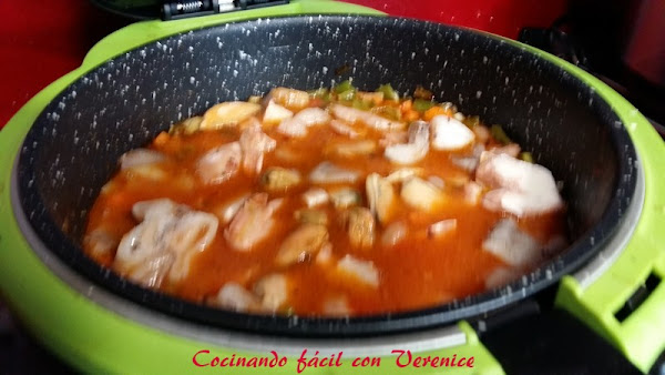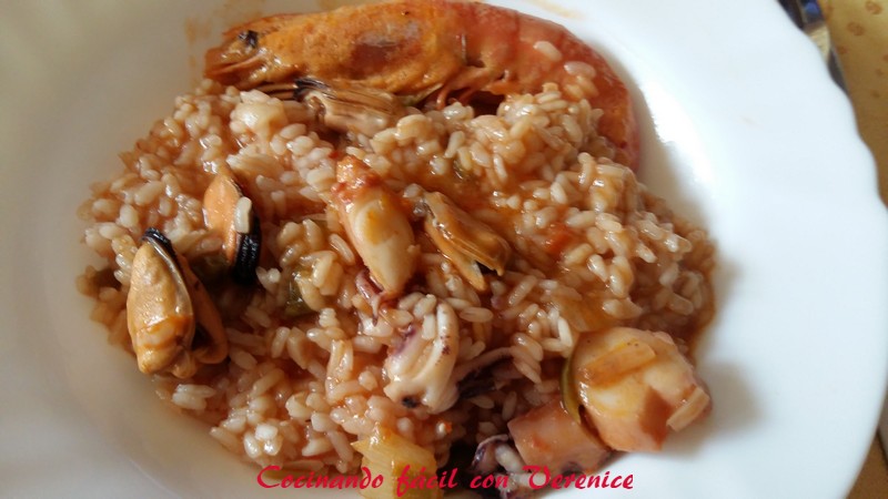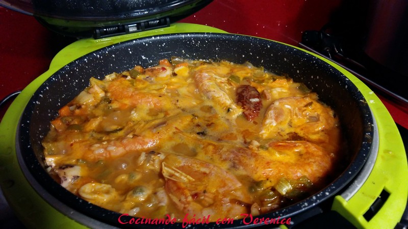 Una vez sofritos se le añaden los calamares limpios y cortados en rodajas, el pulpo cocido y cortado a trocitos, los mejillones y las gambas peladas. Se sigue sofriendo otros 5´.
