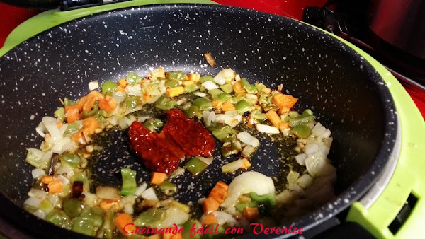 Conectamos la Cecofry: programa Saltear, 20´180º. Calentamos el aceite y le vamos añadiendo cortados a trozos pequeños, una vez ya lavados y escurridos, cebolleta, pimiento y zanahoria. En éste punto le añadimos el tomate seco, que previamente habremos enjuagado muy bien con agua y vinagre, antes de utilizarlo se seca con papel de cocina. Lo sofreímos todo durante 10´.