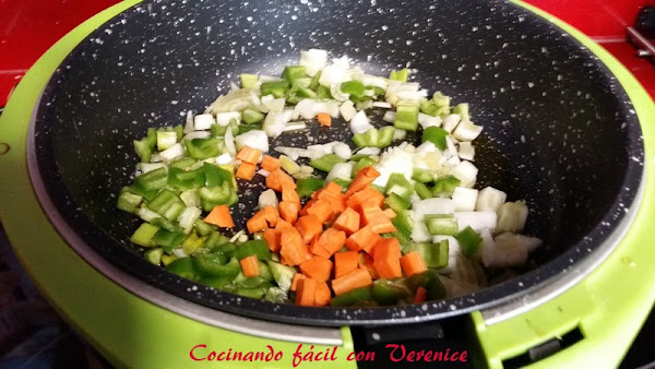 Pelamos, enjuagamos y cortamos las verduras. Apartamos.