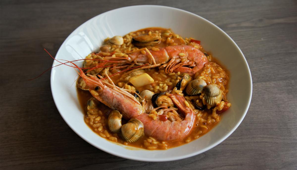 Añadimos la sepia bien limpia en trozos y los mejillones. Cuando estén tiernos, añadimos el tomate y el azafrán y dejamos que reduzca.
