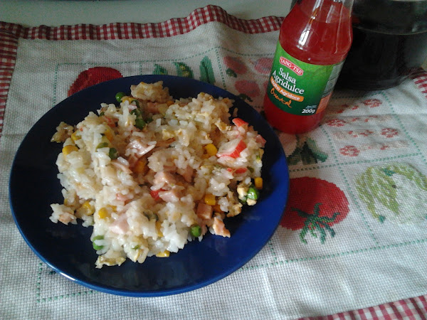 Cuando el arroz ya esté cocido, lo mezclamos con la fritada y le añadimos un buen chorro de salsa de soja.