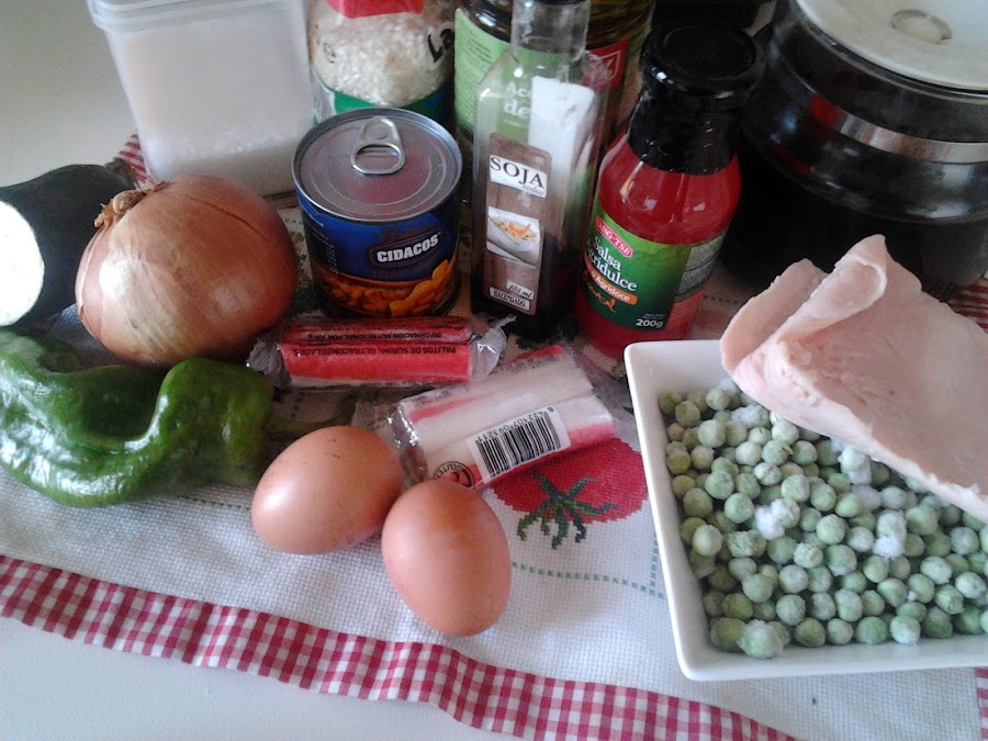 Mientras en una sartén pochamos la cebolla, el pimiento y un poco de calabacín, todo muy picado. Poco a poco vamos incorporando los demás ingredientes: el jamón picado, los guisantes, los palitos troceados y el maíz escurrido. lo mezclamos todo bien y le añadimos los huevos batidos. Lo revolvemos muy bien, para que cuaje el huevo.