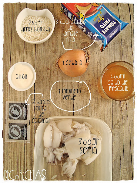 En ese mismo aceite pocharemos la cebolla y el pimiento verde y añadimos la tinta de calamar y el arroz sofriendo durante un minuto antes de añadir el caldo de pescado y el tomate bien caliente