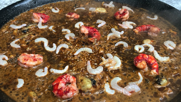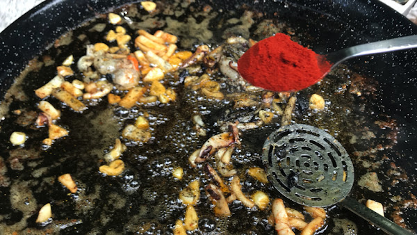 Pon las bolsas de tinta de sepia y/o calamar en la paella, rómpelas y espárcelas por la paella.