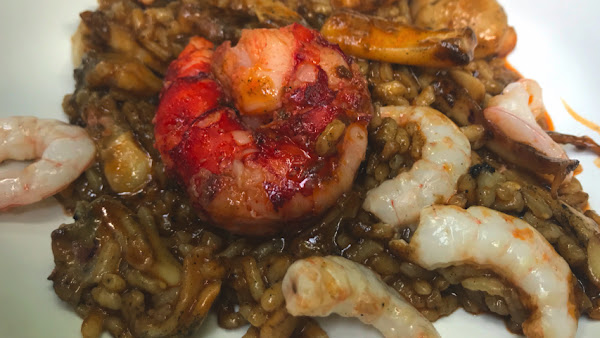 Coloca las colas de carabinero y de gamba sobre el arroz.