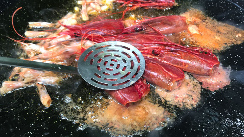 Sofríe las cabezas de los carabineros y de las gambas.