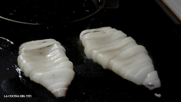 7º Y antes de que el arroz termine de hacerse pondremos el cuerpo de los calamares a la plancha