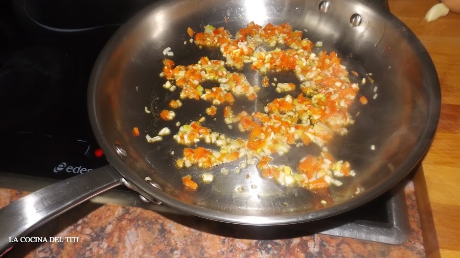 2º Haremos el fondo donde pondremos aceite de oliva, pochamos ajo, pimiento y cebolla finamente cortado