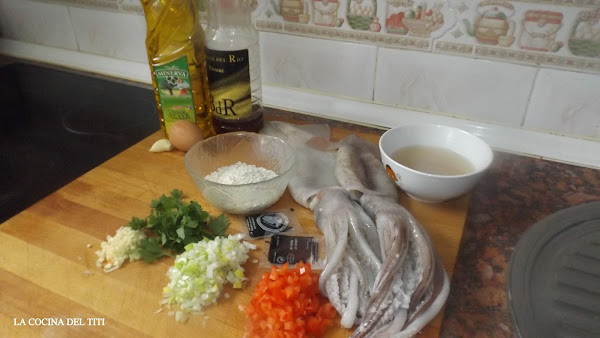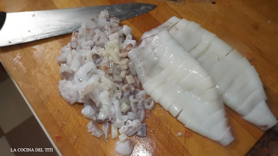 1º Limpiamos los calamares con el cuerpo le hacemos cortes sin llegar a terminar de cortarlo para mantenerlo entero y no se deshaga y con sus tentaculos y aletas cortamos en trocitos pequeños