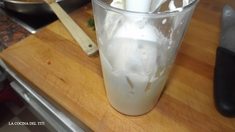 6º Montamos el alioli en el que batimos el huevo, el ajo, el vinagre y una pizca de sal