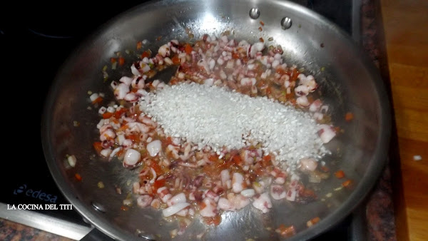 5º Añadimos la tinta y el caldo, en cuanto a la cantidad de caldo o fumet ya va en dejarlo mas jugoso o mas seco. A mi en particular para este arroz me gusta mas bien en seco pues luego acompañado del alioli nos lo va poner mas meloso y suave