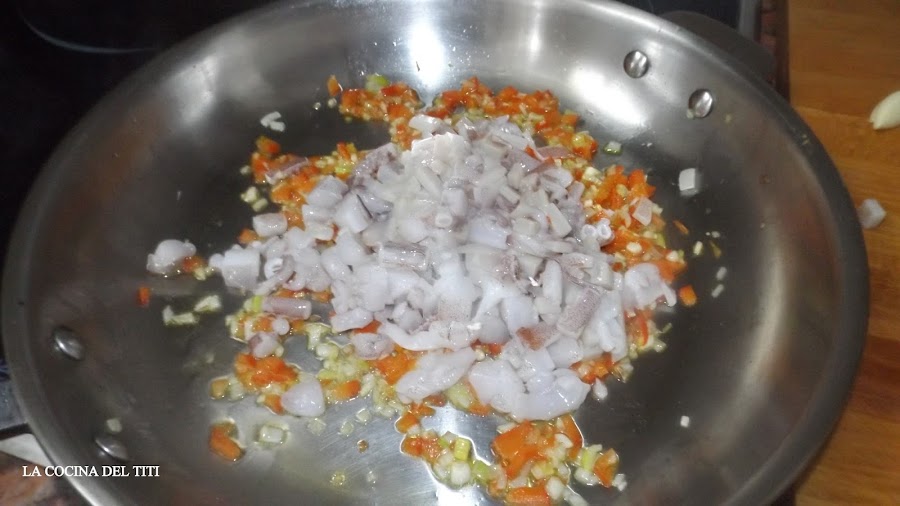 3º Añadimos los tentaculos, aletas cortados y rehogamos durante 3 minutos en el que quede ligeramente dorado