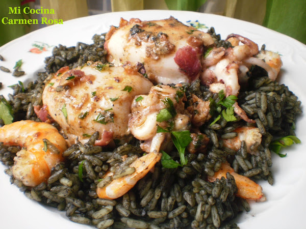 doce langostinos, cuatro puñados de arroz (aunque para éste tipo de arroces suelo utilizar redondo, he usado un arroz alargado pero nacional, no tipo oriental), el doble de volumen de agua que de arroz (suelo echar ocho cucharones) de caldo de pescado (suelo usar la espina de rosada y la piel junto con las cabezas de los langostinos), media cebolla blanca, cuatro dientes de ajo, un tomate maduro, una ramita de perejil, un sobre de tinta de calamar (lo venden en cualquier supermercado, en la sección de congelados), medio vaso de aceite de oliva virgen extra (¿han probado los aceites malagueños?, les animo a ello), sal.